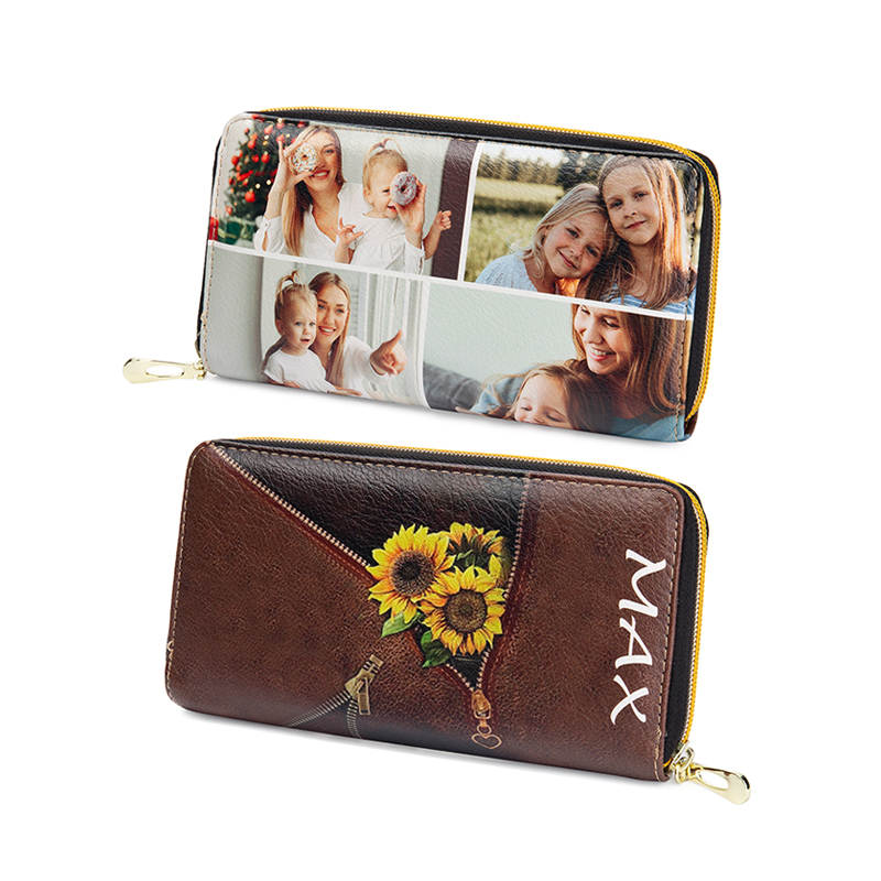 Personalized 4 Photos Wallet Leather Zipper Wallet Sunflower Women Purse