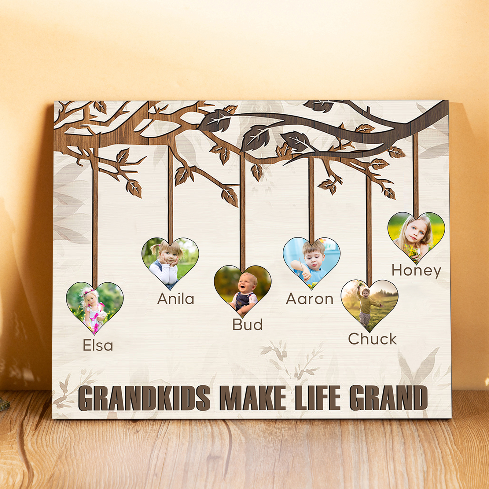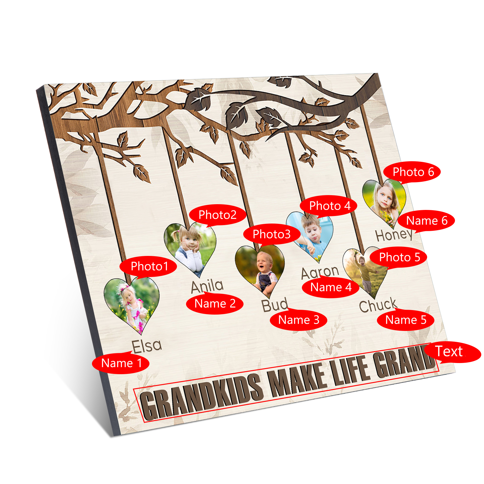 Personalized Family Tree Wall Art Frame Custom 6 Names 6 Photos Wood Panel Painting Wooden Gift for Family