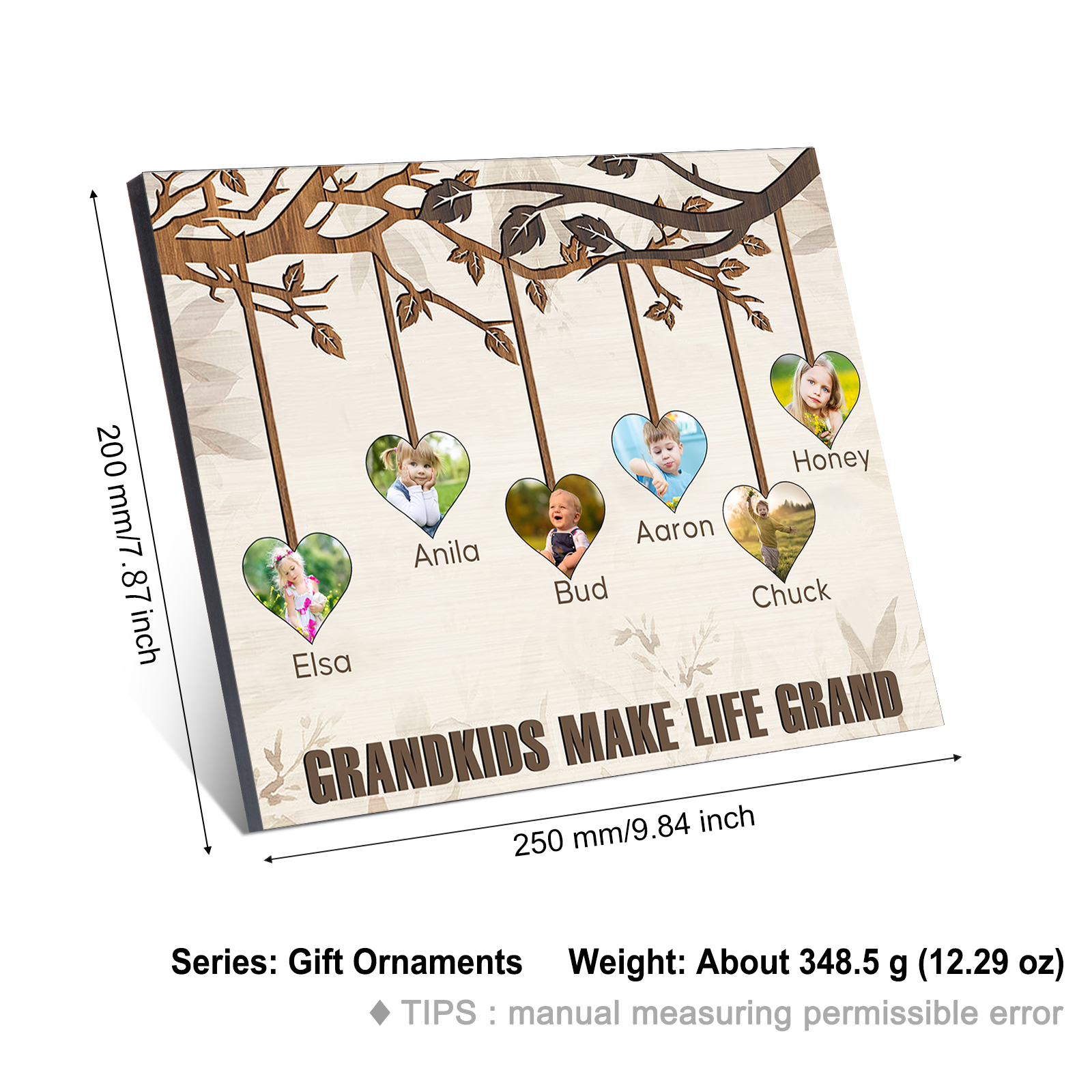 • Engraving: Up to 6 Names of 10 characters each, including spaces. A special message and 6 photos.