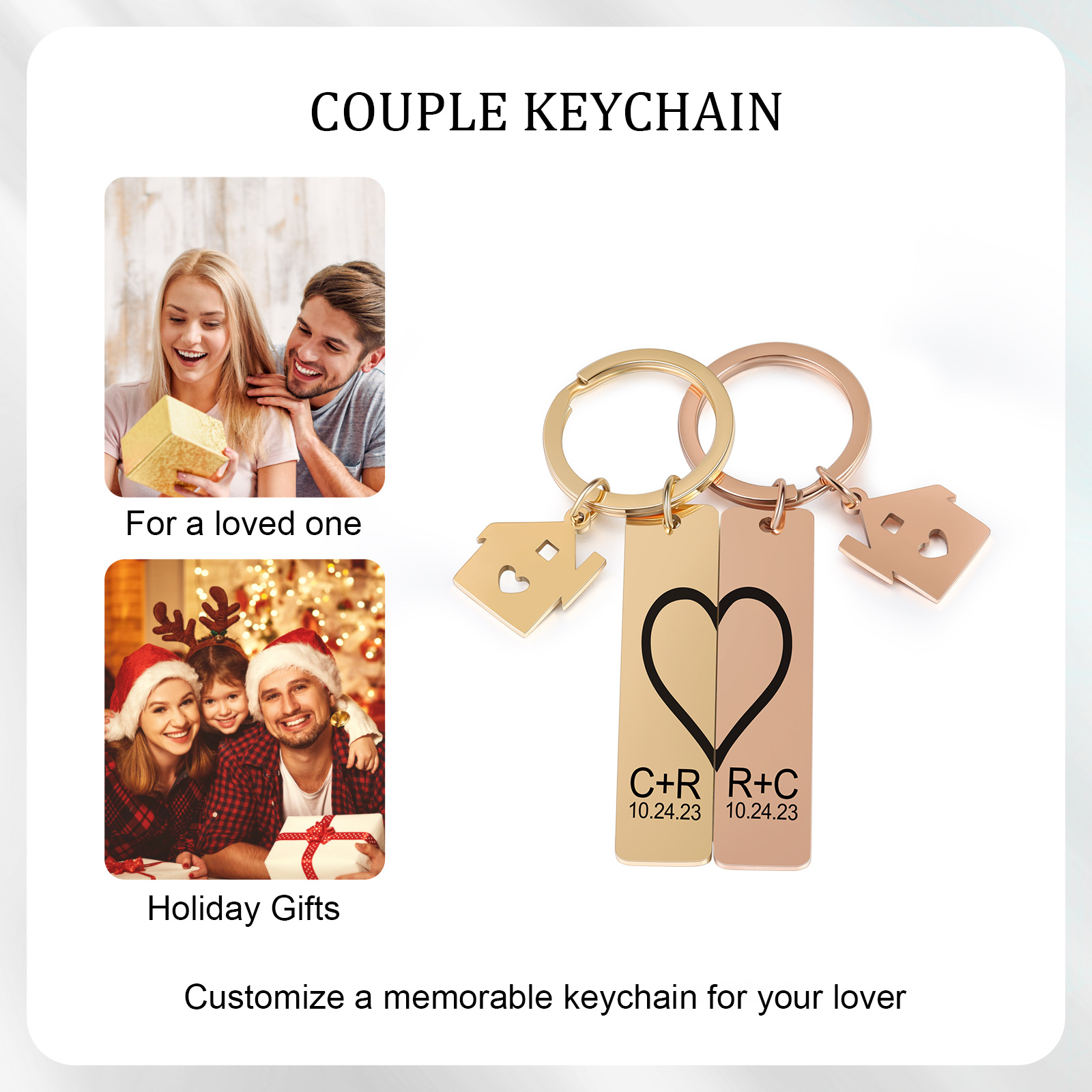 Personalized Heart Couple Keychain Set Engraved Date Initial Matching Couple Gift