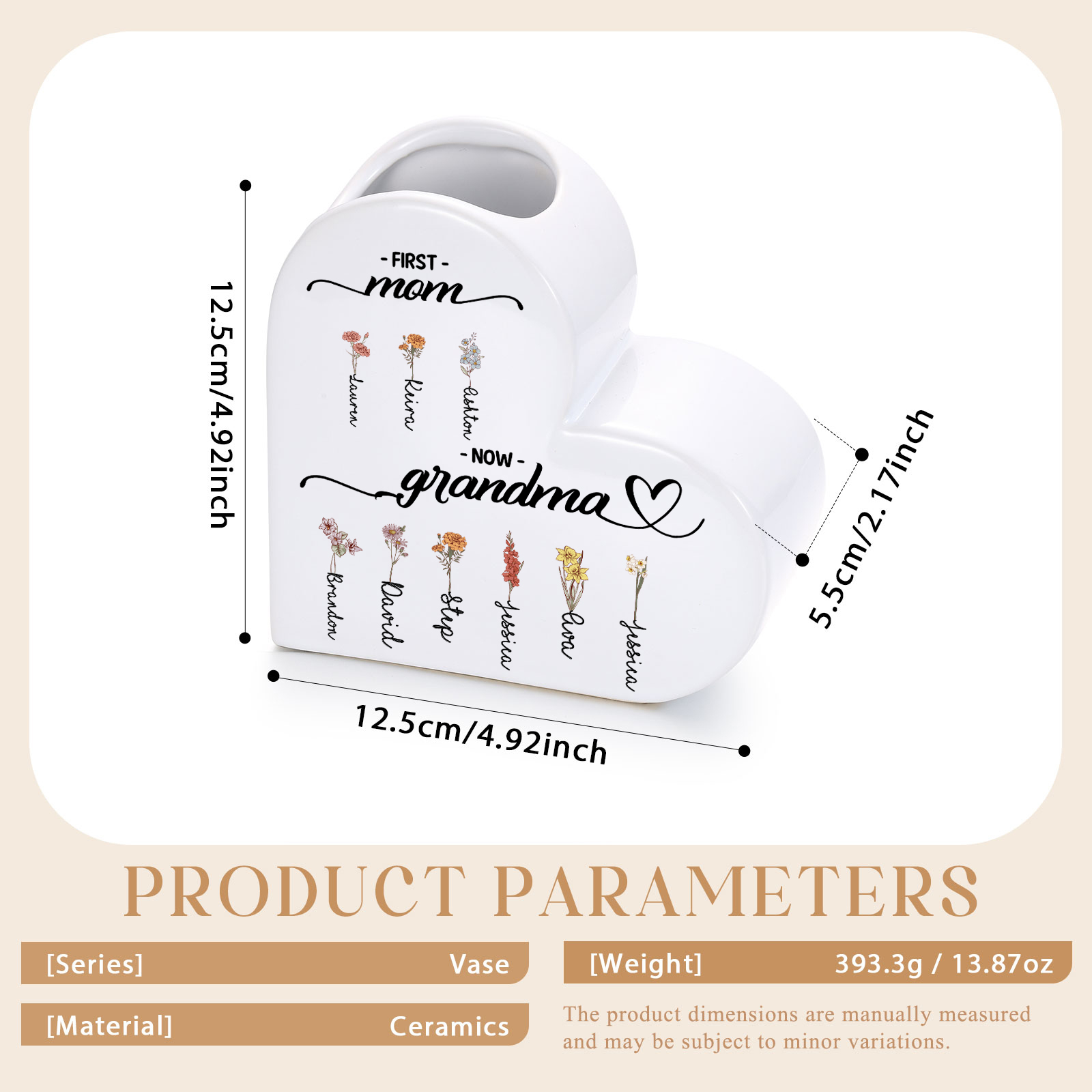 Give a heartfelt and practical gift with this personalized heart-shaped ceramic vase, created especially for moms who have become loving grandmas. Custom printed with floral illustrations and family names, it turns any bouquet into a daily reminder of the people she cherishes most.