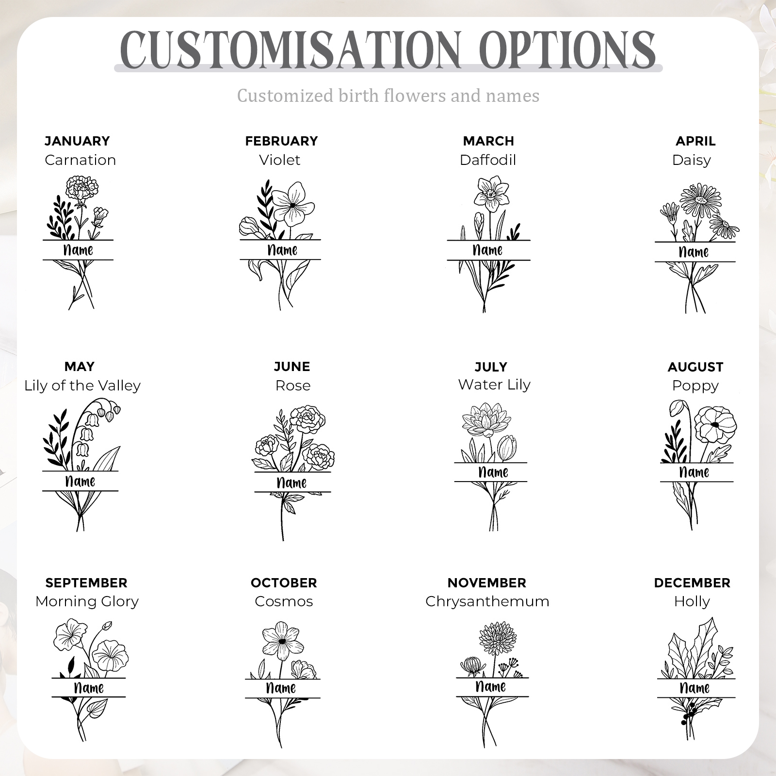 ✨ Each wallet is beautifully crafted with a delicate floral design, featuring the recipient's name elegantly engraved alongside their birthday flower.
