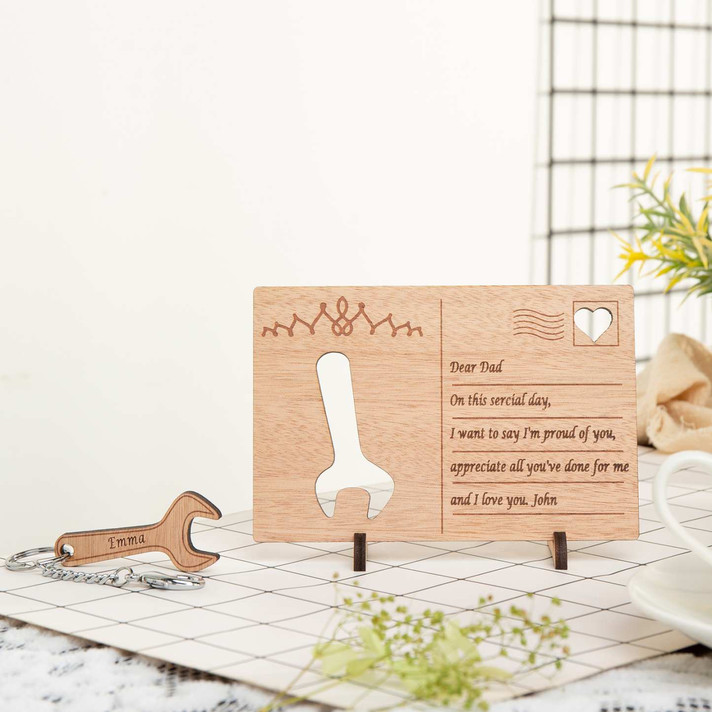 Personalized Wooden Postcard Keychain Set Tool Keepsake for Dad