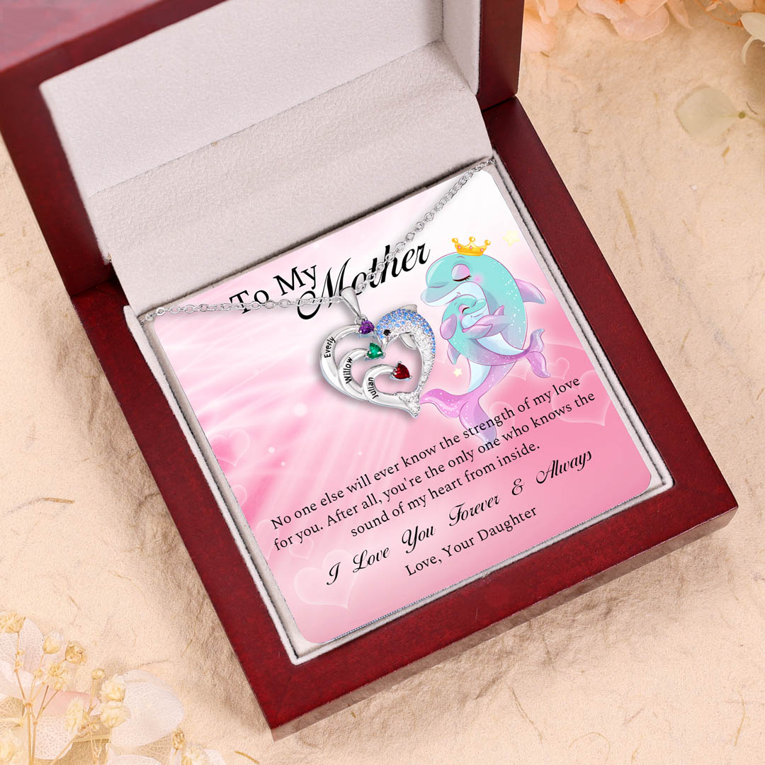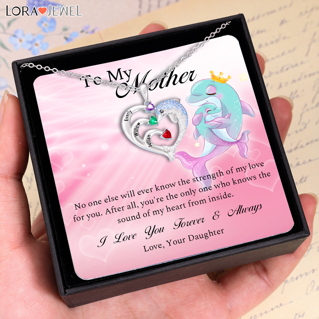 To My Mother Heart Dolphin Necklace Custom 3 Birthstones Gift