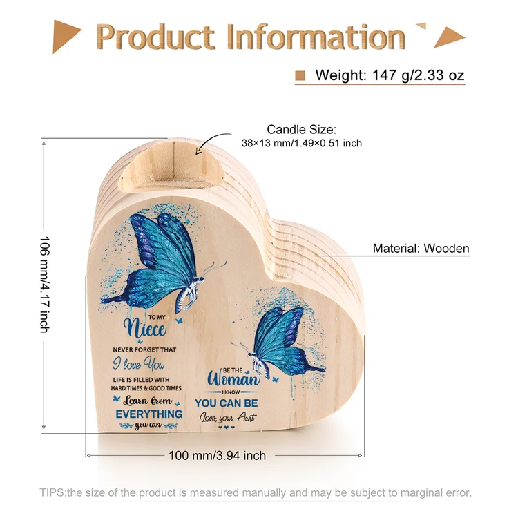 To My Niece Heart Candle Holder Never Forget That I Love You Wooden Blue Butterfly Candlestick