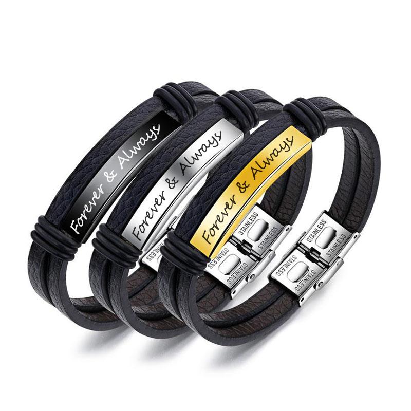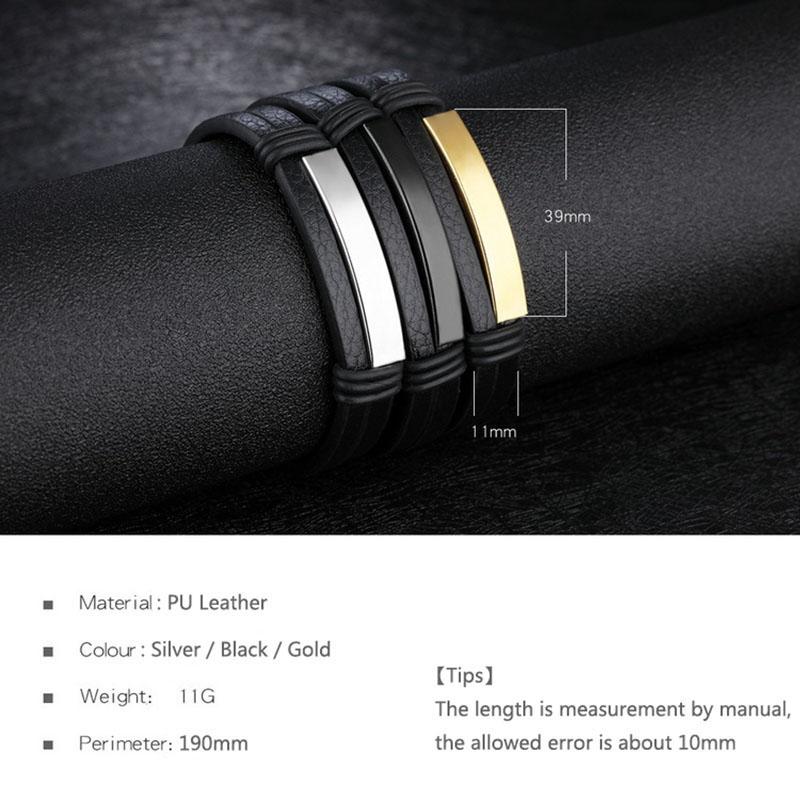 Mens Leather Bracelet Black Engraved Personalized Bracelet Stainless Steel in Gold