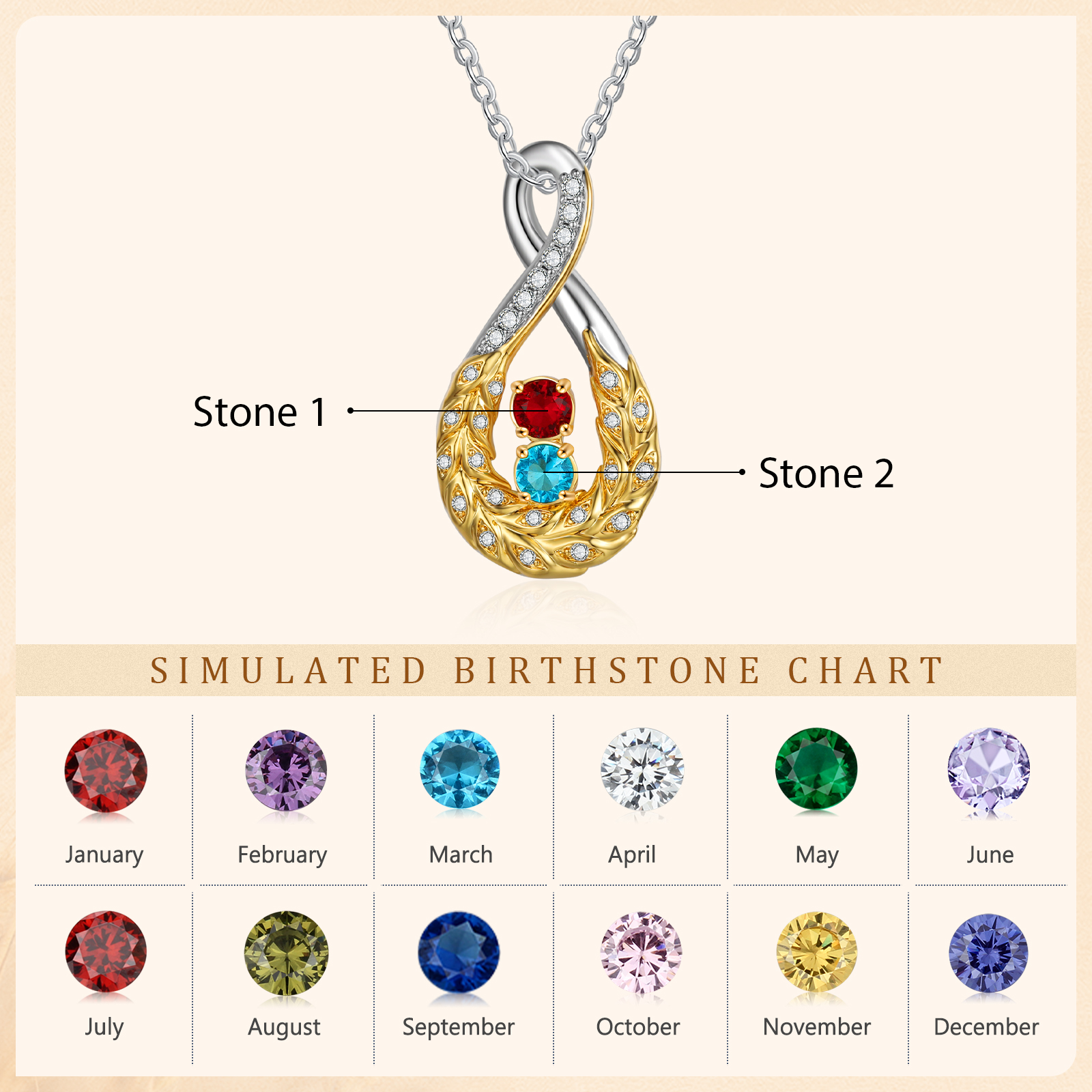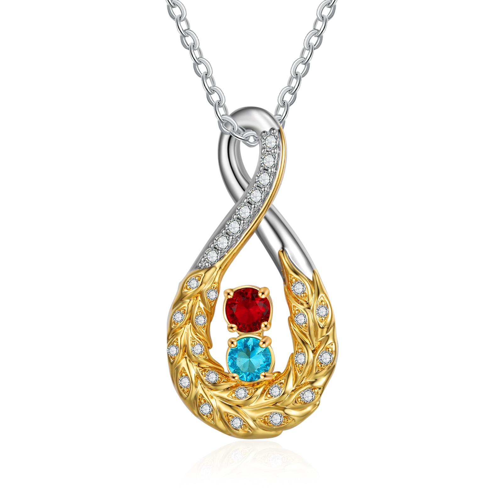 Feather Inifinity Necklace with 2 Birthstones Birthday Anniversary Gift for Mother Wife