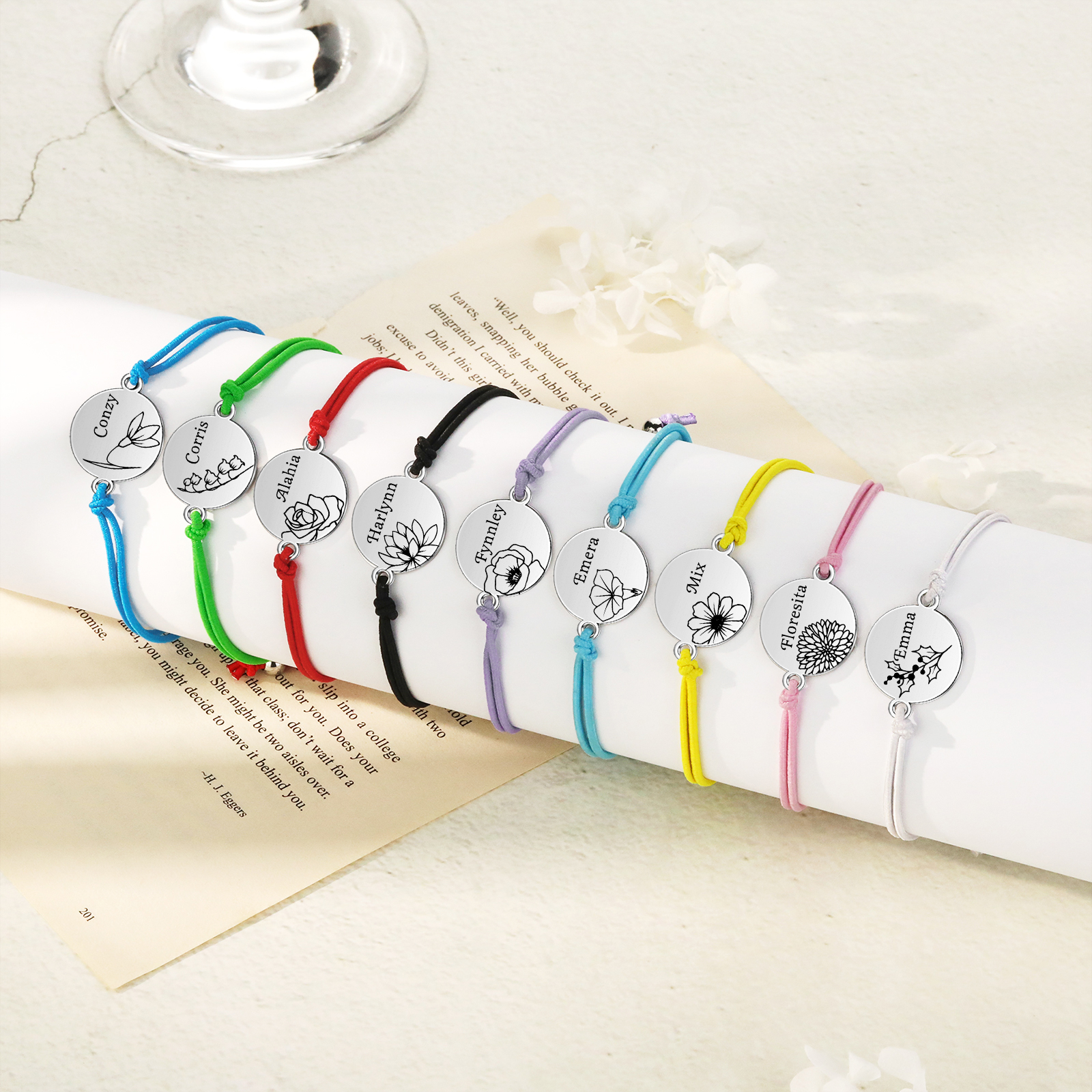 2 Pcs Bracelet Set Personalized Names & Birth Flowers Adjustable Bracelets with Message Card Back to School Gifts for Daughters