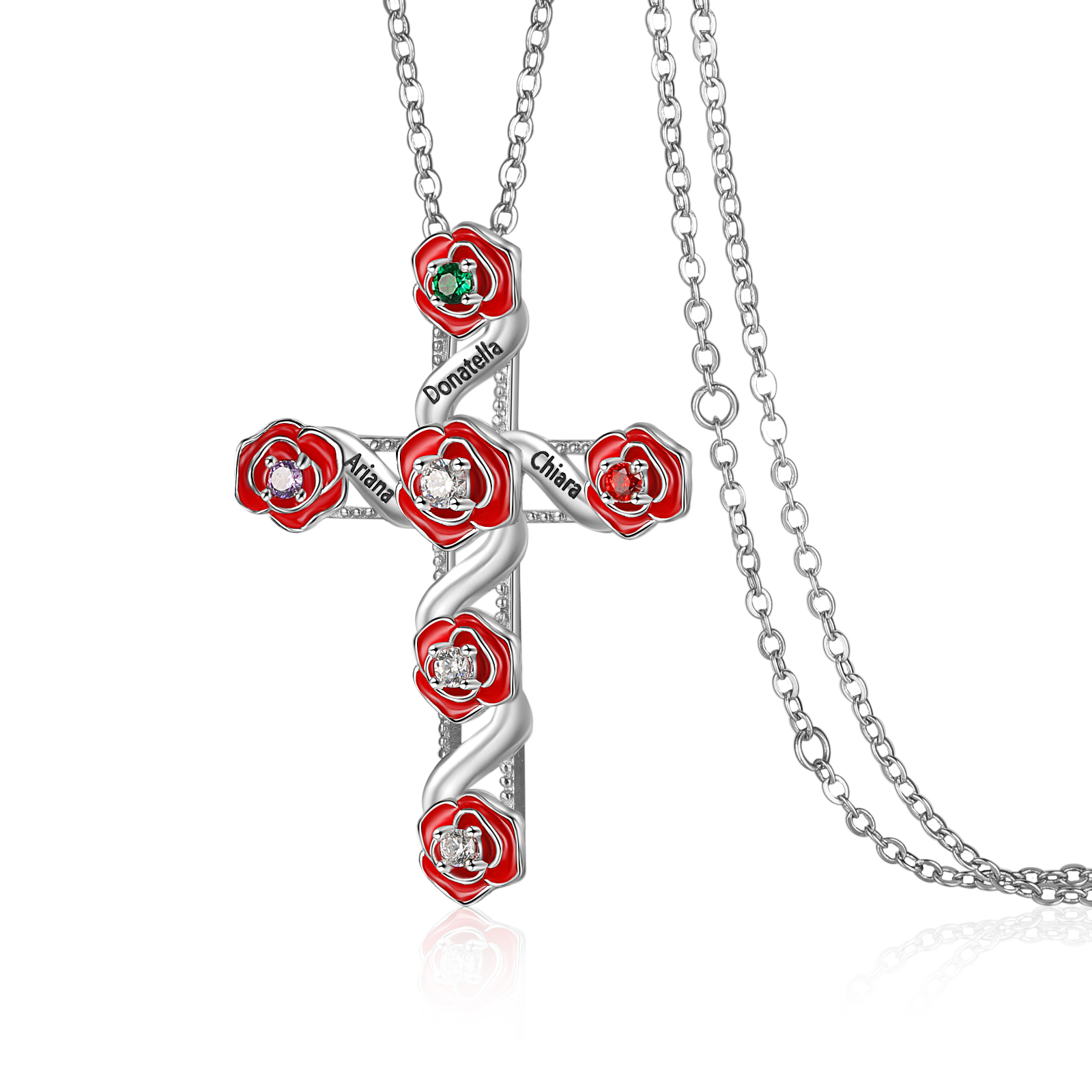 Confirmation Gift Personalized Rose Cross Necklace with 3 Birthstones Engraved Names for Her