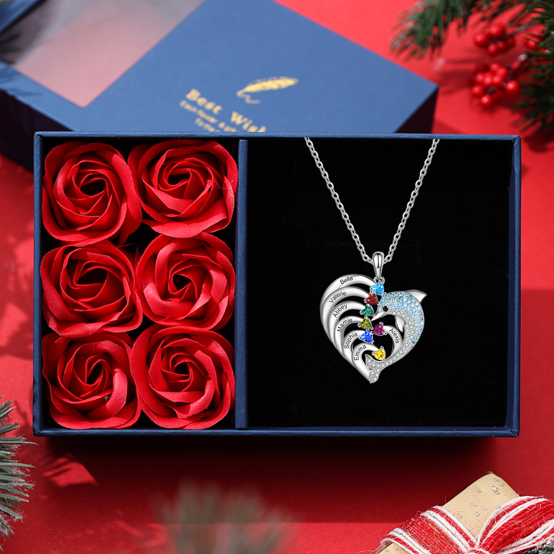 Personalized Heart Dolphin Necklace Custom 7 Birthstones Necklace for Her